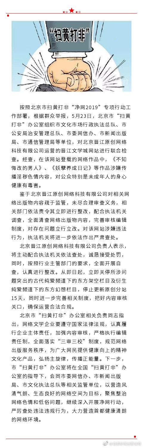 继起点之后,晋江文学城也在最新的净网专项行动中遭到整治。不同于起点,此次晋江的公告中特别提到了《不知悔改的男人》、《妖孽养成日记》这两部作品。