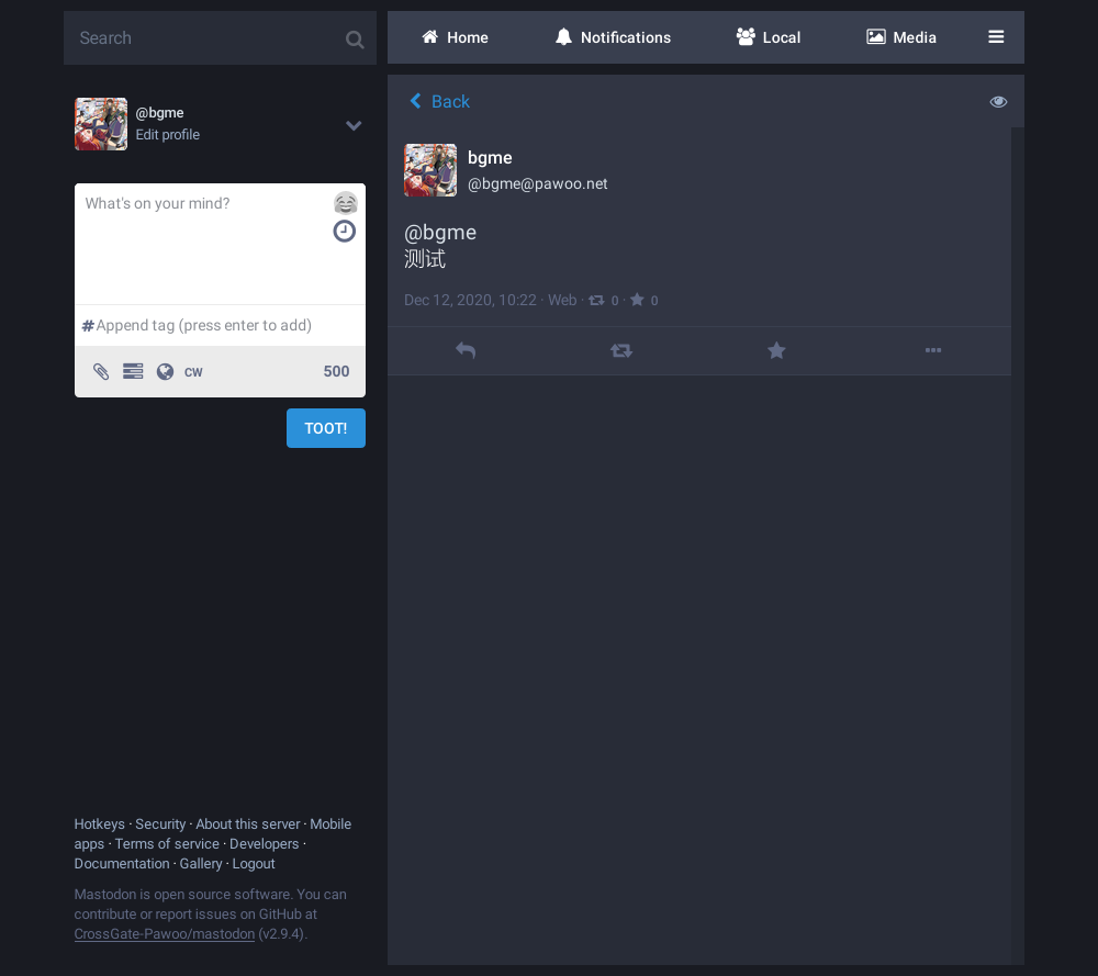 BGME实例可以看见Pawoo实例发出的消息,但Pawoo实例看不见BGME实例发出消息。