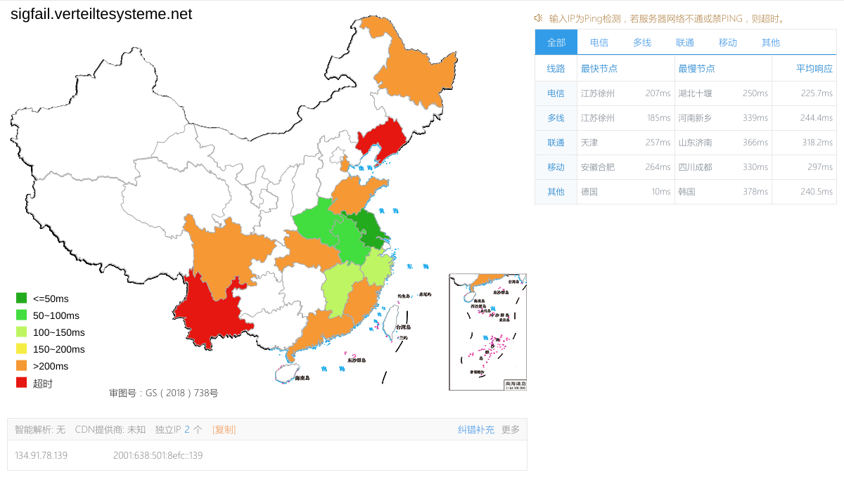 使用站长之家的ping工具和 17CE 对 sigfail.verteiltesysteme.net 进行检测,可以发现,绝大多数监测点均正常得到了目标IP,而非解析失败。